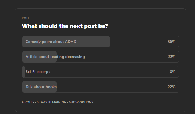 Interesting nobody voted for Sci-Fi, but I get it, half a story isn’t as fun as a whole story. I’m working on that. Some short stories will soon become downloadable eBooks on my bookfunnel page.