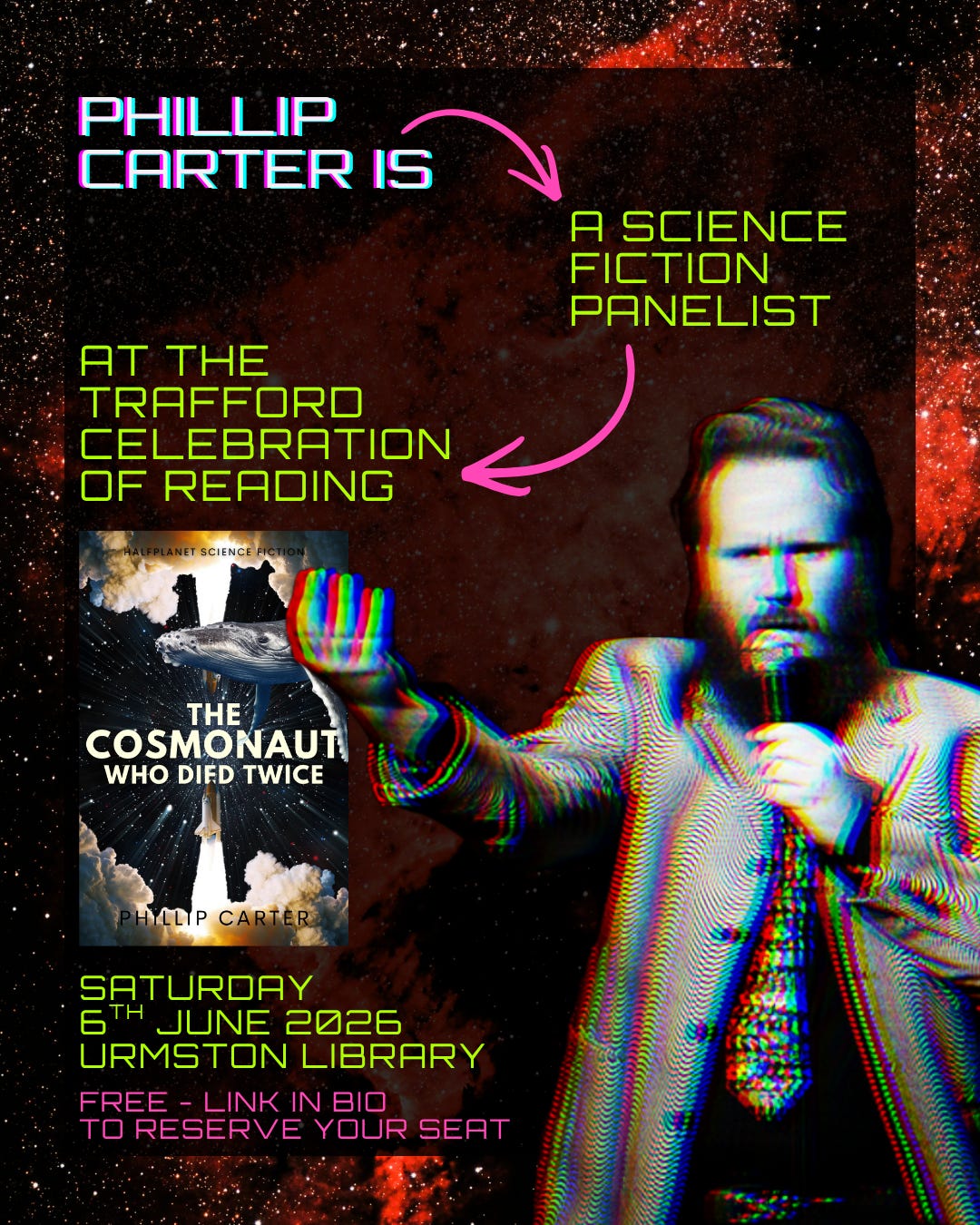 The event is at Urmston Library (UK) on the 6th of June 2026. You can reserve a free seat (advisable) using the link below.