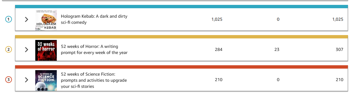 What’s interesting is that it is not my main book (Who Built The Humans?) which is in my top 3, but the two prompt books, and a silly dark comedy (which I made free for a while, resulting in some 3 star reviews from people who did not find it funny at all).